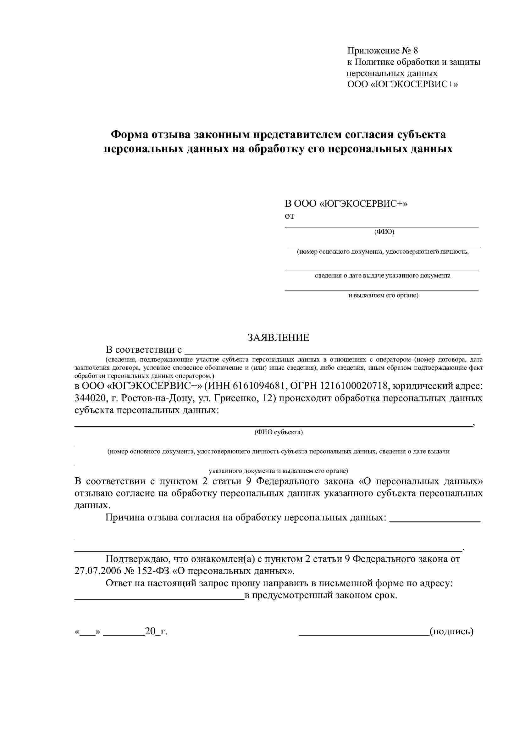 6.11. Для отзыва согласия Субъекта персональных данных на обработку его персональных данных субъекту (либо законному представителю) необходимо заполнить соответствующую форму отзыва согласия субъекта персональных данных на обработку его персональных данных (приложение 4 или 8) и передать лично работникам ООО «ЮГЭКОСЕРВИС+», принимающим обращения граждан, либо по почте. В случае отзыва согласия на обработку персональных данных ООО «ЮГЭКОСЕРВИС+» вправе продолжить обработку персональных данных без согласия субъекта персональных данных при наличии оснований, указанных в пунктах 2 - 11 части 1 статьи 6, части 2 статьи 10 и части 2 статьи 11 Федерального закона от 27.07.2006 № 152-ФЗ «О персональных данных».